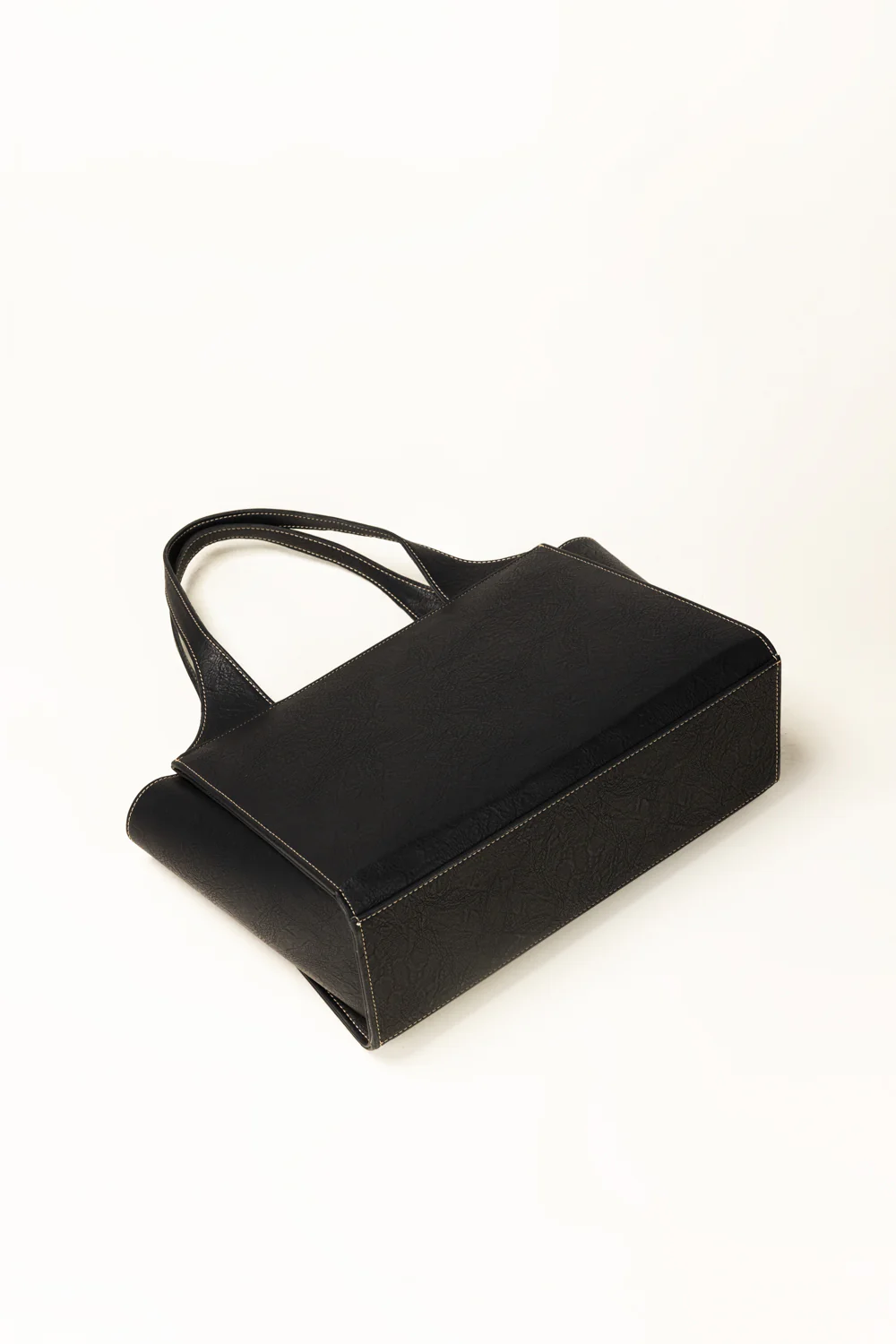 Crafted from black faux leather, this tote bag features a clean, structured silhouette with subtle contrast stitching that adds a refined touch. Designed to be both spacious and durable, it comfortably carries daily essentials while maintaining its elegant shape. A timeless and versatile accessory, it transitions effortlessly from workdays to weekends.