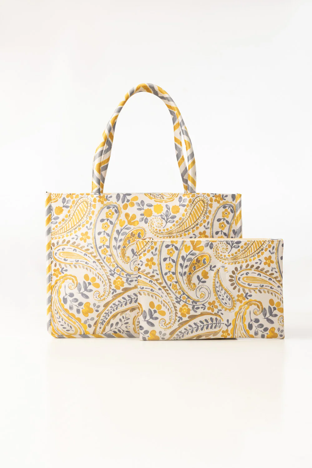 This elegant tote bag set features a soft paisley design in warm yellow and neutral grey shades. The roomy tote offers plenty of space for daily essentials and errands. A coordinated zip pouch adds convenient organization for smaller items. Crafted from velvet fabric, it’s a practical yet stylish everyday accessory.